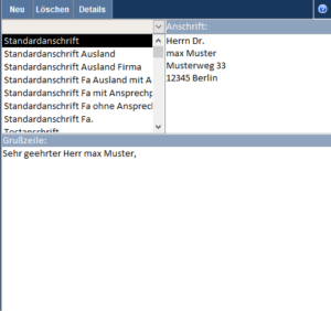 Anschriften Unterformular zum Anzeigen und Bearbeiten von Anschriften. Befehlsschaltflächen oben: „Neu“: legt eine neue Anschrift an „Löschen“: löscht die gewählte Anschrift „Details“: