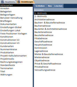 Adressarten, Anreden, Belegarten, Belegvorlagen, Benutzer-Verwaltung, Briefbögen, Dokumentenarten, Einstellungen global, Einstellungen lokal, Freie Positionen Vorlagen, Konditionen, Konstruktionen V2, Konstruktionen V3, Kundenarten, Nummernkreise, Produktarten, Projekt-Kalkulationsarten, Projektmodis, Rechnungskategorien, Standardtexte, Terminarten, Titel, Währungen.