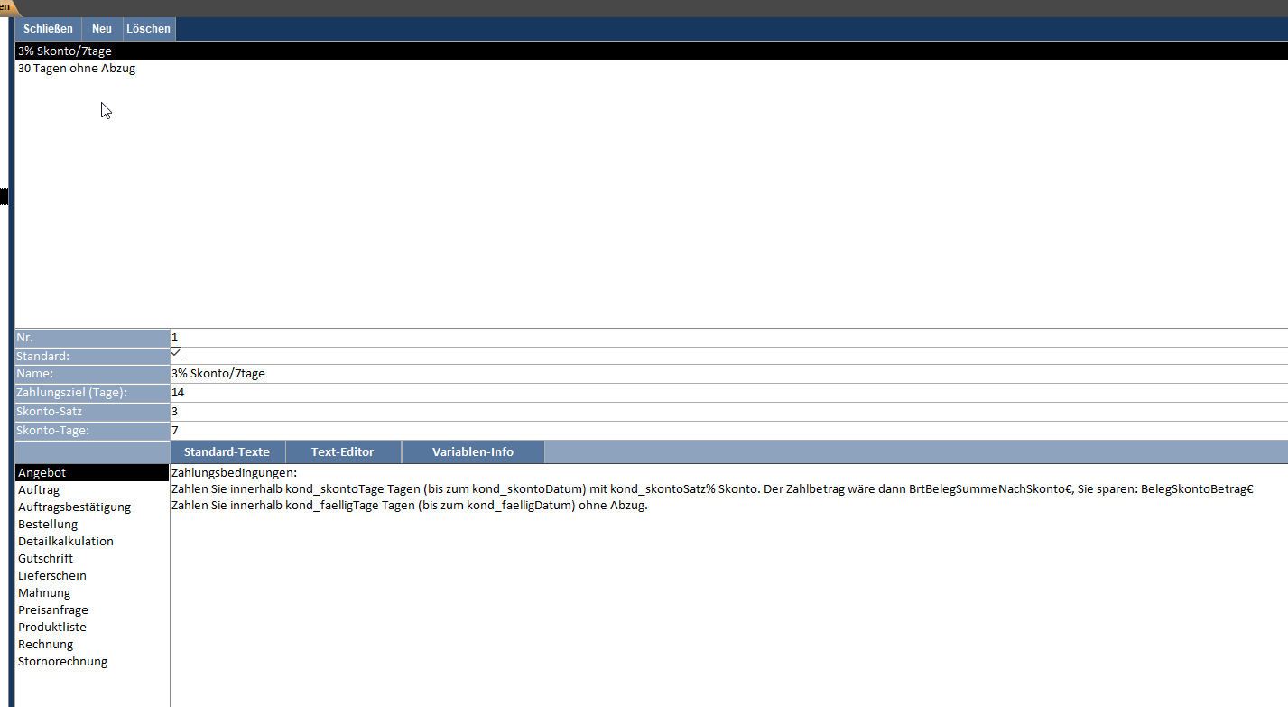 Die neue Konditionsverwaltung kann beliebig viele Konditionen aufnehmen. Es kann ein Zahlungsziel und eine Skontozeit in Tage hinterlegt werden. Für jede Belegart können die Konditionstexte definiert werden.